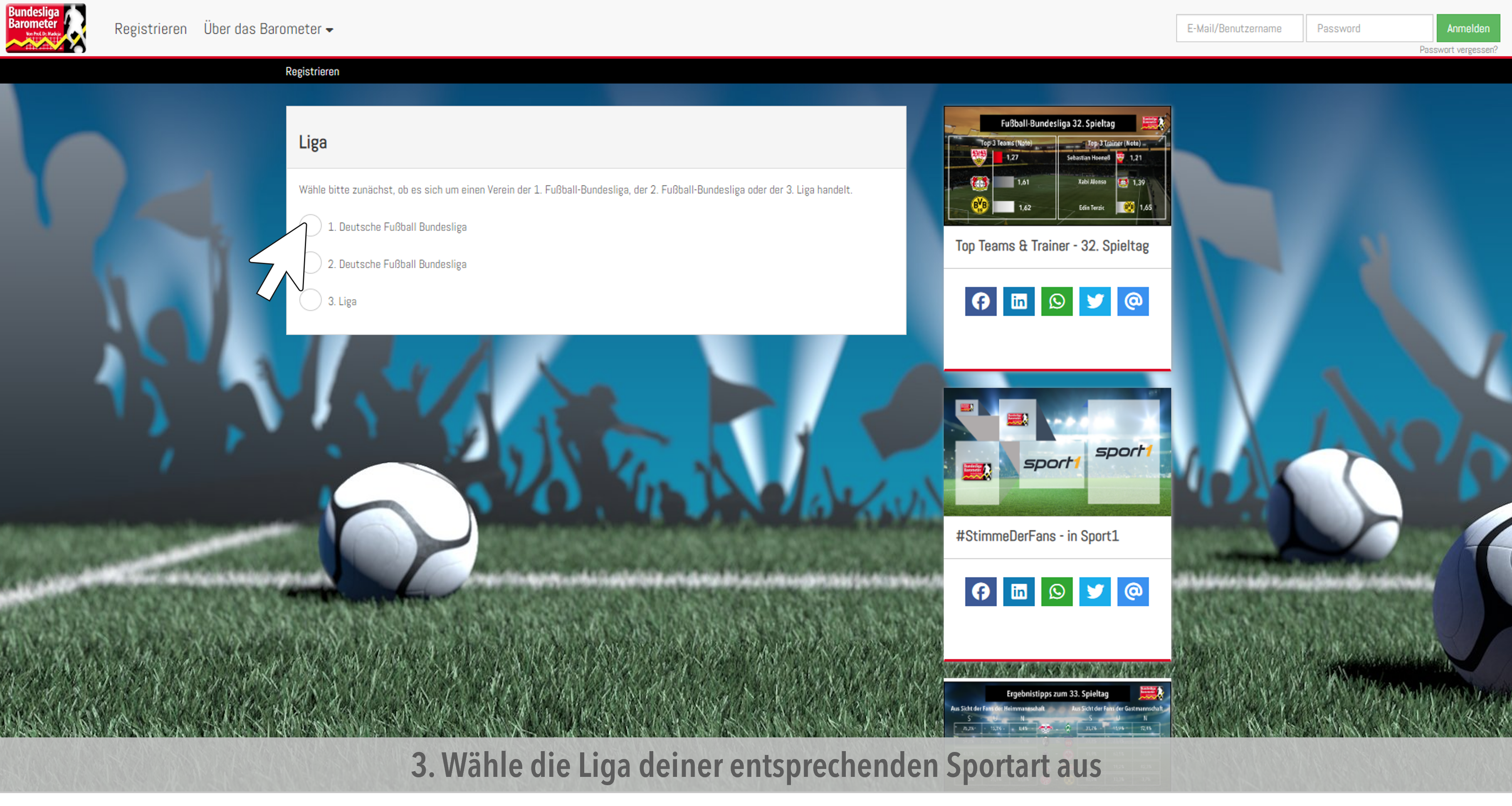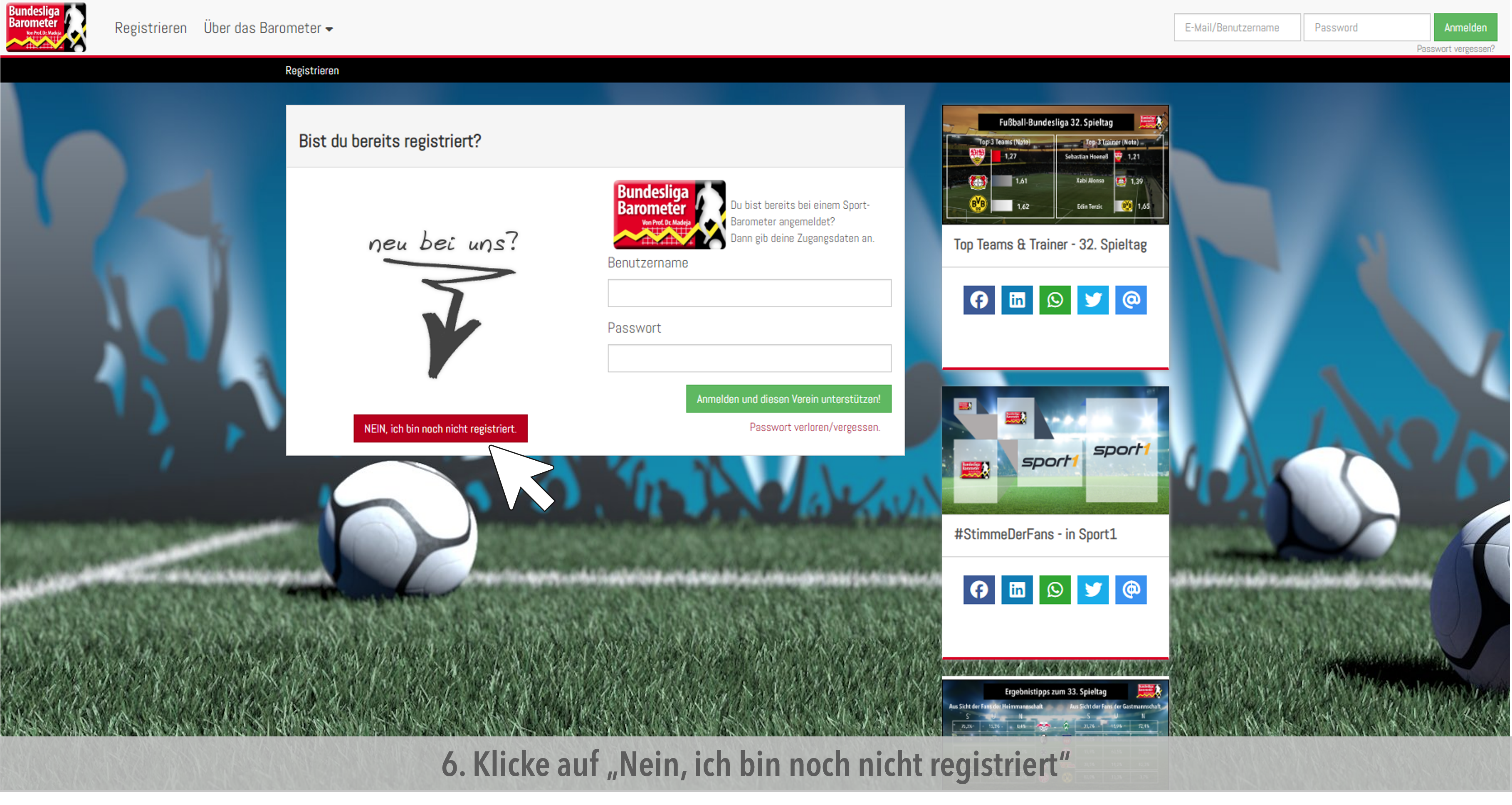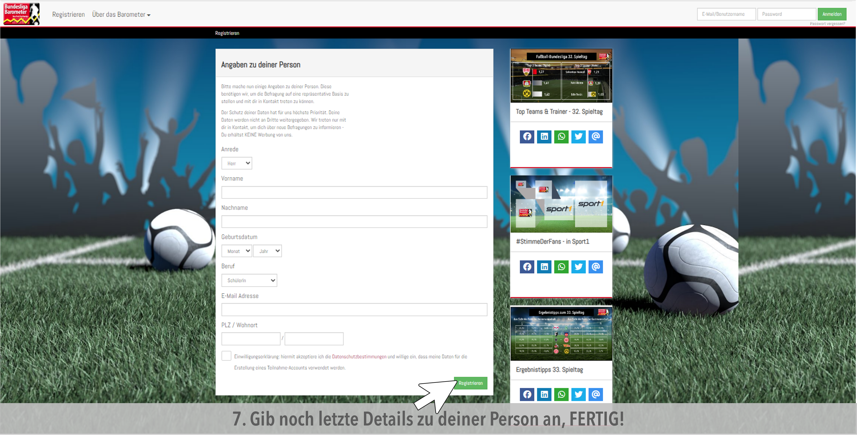 • Nachdem du auf den Link in der Email geklickt hast oder in deinem Browser www.bundesligabarometer.de eingegeben hast, loggst du dich hier ein, um in dein Profil und zur Befragung zu gelangen