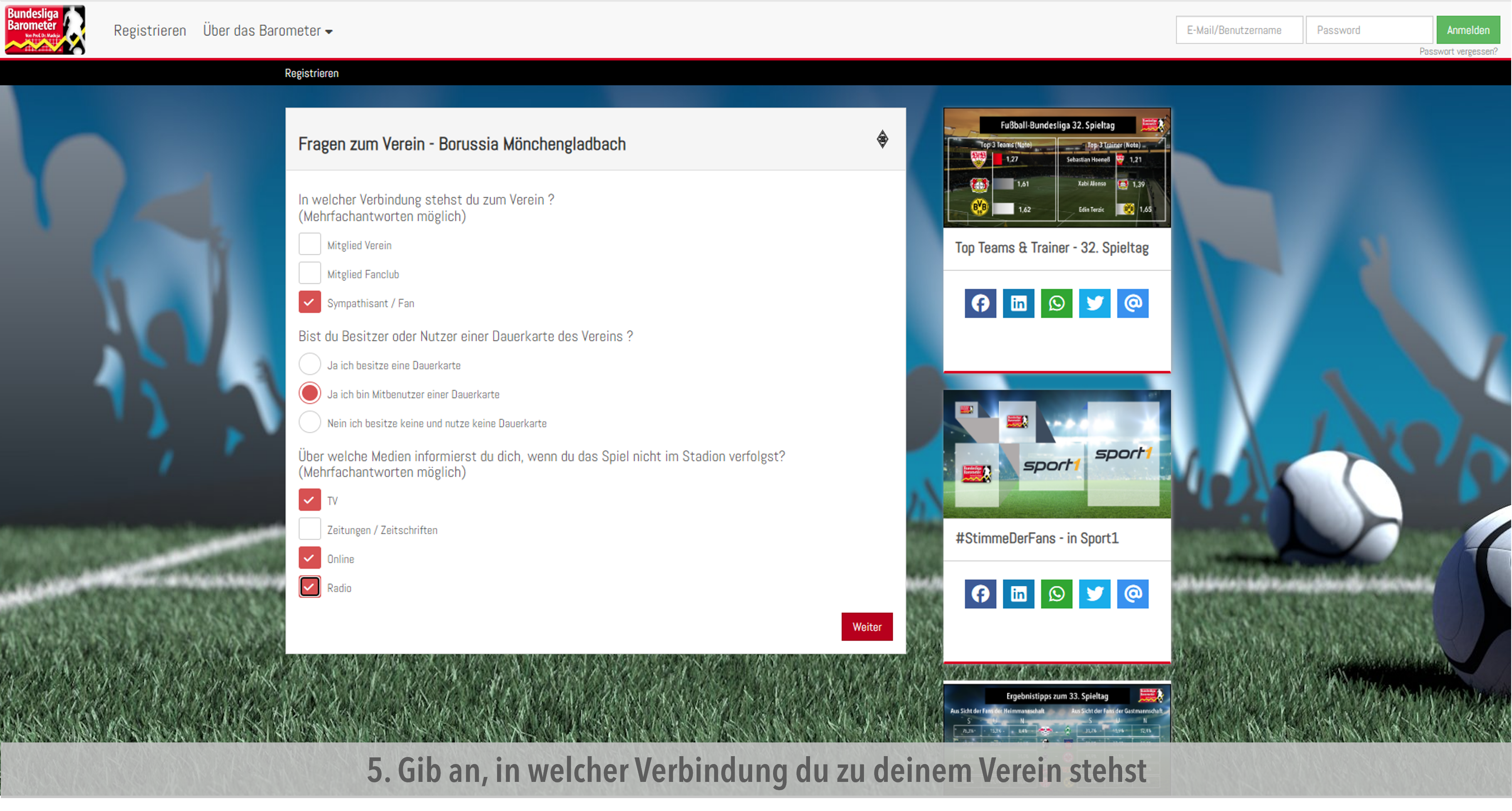 • Nun kannst du ein paar Details zu deiner Verbindung zu deinem Verein angeben - wie du dich über ihn informierst und wie eng du mit ihm verbunden bist.